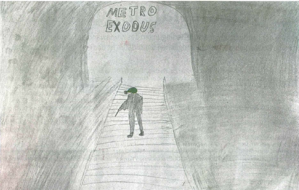 Zu der Zeichnung schreibt Hilke Lorenz, dass sie einen tunnelartigen Gang zeigt, „aus dem eine Treppe ans Licht führt. Am Ausgang steht ‚Metro Exodus‘. Die Zeichnung gleicht den Bildern der überfüllten Metrostationen, die überall in der Ukraine für die Menschen zu Bunkern gegen die russischen Raketenangriffe wurden. Auf der Treppe steht ein dunkel gekleideter Mann. Er hält eine Waffe in der Hand und hat eine grüne Gasmaske über dem Gesicht. ‚Ein Held‘, sagt Lev. Mehr will er nicht erklären“, schreibt Hilke Lorenz. Nur, dass das ein Computerspiel ist.